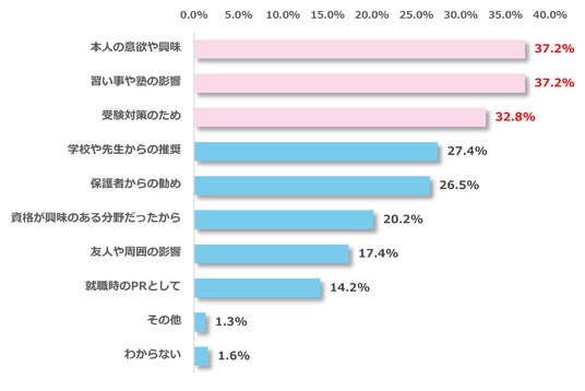 資格・検定を取得しようと思ったきっかけ、最多は「本人の意欲や興味」と「習い事や塾の影響」が同率