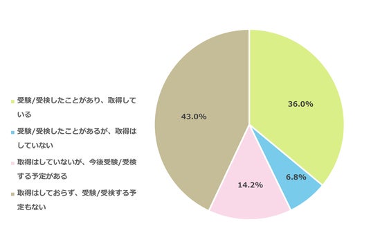 小中学生の子どもを持つ全国の保護者880名を対象に、子どもの資格や検定の受験/受検・取得状況について調査を実施しました。その結果、36.0%が「受験/受検したことがあり、取得している」、6.8%が「受験/受検したことがあるが、取得はしていない」、14.2%が「取得はしていないが、今後受験/受検する予定がある」、43.0%が「取得はしておらず、受験/受検する予定もない」という結果になりました。