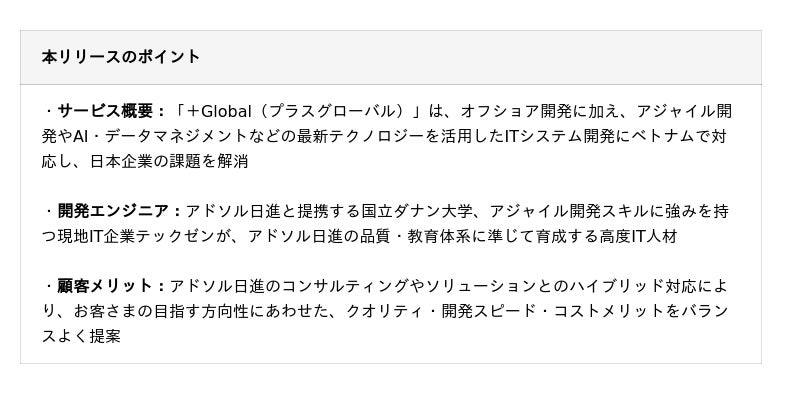 アドソル日進株式会社(本社:東京都港区、代表取締役社長 篠崎俊明、以下:アドソル日進)は、長年培ったオフショア開発実績とAI・アジャイル開発・データマネジメントなどの最新技術・ナレッジを統合したグローバルITサービス「+Global(プラスグローバル)」の提供を開始します。