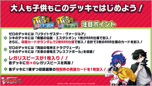 株式会社ブシロード(本社:東京都中野区、代表取締役社長:木谷高明)は、3月28日(金)にスペシャルシリーズ「ぶっちぎりスタートデッキ “力”で勝負だ!天導ゼロ」、「ぶっちぎりスタートデッキ “技”で勝負だ!央亭シキ」を発売することをお知らせいたします。