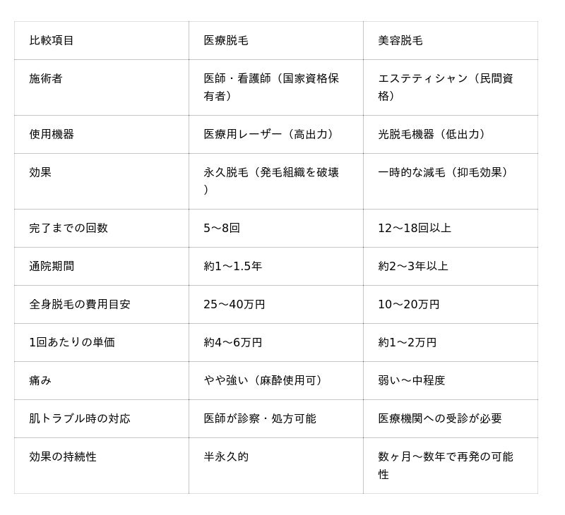 結論から言うと、確実な永久脱毛効果を求める方には医療脱毛、痛みを抑えて低コストで始めたい方には美容脱毛が向いています。医療脱毛は5~8回で完了し費用は全身で25~40万円、美容脱毛は12~18回以上必要で費用は10~20万円が目安です。ただし美容脱毛は数年後に再び毛が生えてくる可能性があるため、長期的なコストパフォーマンスでは医療脱毛が優位となります。