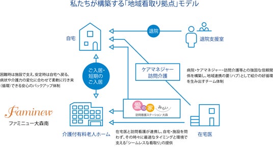 当社はこれまで、認知症グループホーム「愛の家」や介護付有料老人ホーム「アンサンブル」「ファミニュー」など、施設運営を中心に20年以上にわたり地域介護を支えてきました。これまでの施設運営で培った生活支援の知見に、専門的な看護機能を加えることで、在宅生活の継続をより多角的に支援する体制を構築いたします。