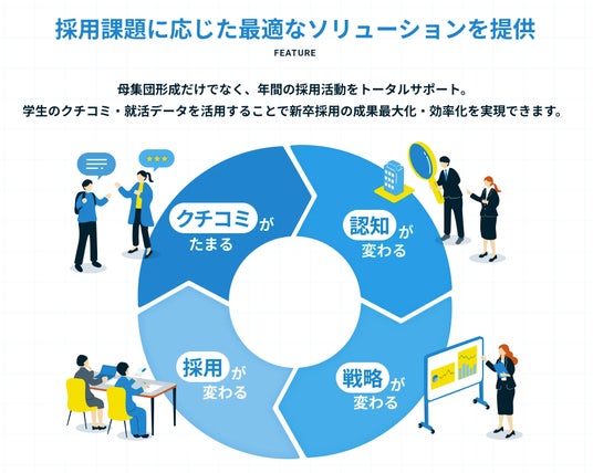 会社情報や求人広告を掲載できる「求人掲載機能」をはじめ、国内最大級の学生データベースを活用して学生にアプローチできる「スカウト機能」、オンライン説明会をはじめとした高品質なデジタルコンテンツで採用ブランドを構築する「動画サービス機能」、採用活動計画の立案に必要なマーケティングデータを提供する「採用計画機能」をご用意しております。