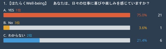 本ワークショップに参加した生徒たちに対する「日々の仕事に喜びや楽しみを感じていますか?」という問いでは、「YES(75.0%)」が最も高い結果となりました。生徒たちの多くが仕事にポジティブな感情を見いだしており、「仕事=喜びや楽しみを感じられる場」という価値観が広がっていることがわかります。