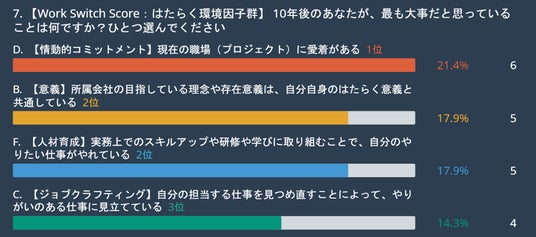 「自分の仕事は人々の生活をより良くしているか(貢献)」という問いに関しては、「YES(50.0%)」が最も高い結果となりました。他の設問では、はたらく環境因子の第2位に「所属会社の目指している理念や存在意義は、自分自身のはたらく意義と共通している(17.9%)」がランクインしていることから、単にタスクとして仕事をこなすのではなく、自分の価値観と組織の目指す方向性が一致していること(=意味のある貢献)を、10年後のはたらく環境として重要視していることがわかります。