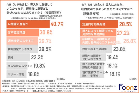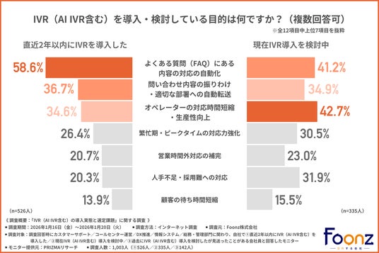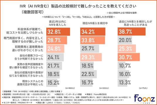Foonz株式会社(所在地:神奈川県横浜市西区、代表取締役:星野 純一)は、カスタマーサポート/コールセンター運営/DX推進/情報システム/総務・管理部門に関わり、自社で1.直近2年以内にIVR(AI IVR含む)を導入した/2.現在IVR(AI IVR含む)導入を検討中/3.過去にIVR(AI IVR含む)導入を検討したが見送ったことがある会社員を対象に、「IVR(AI IVR含む)の導入実態と選定課題」に関する調査を実施しました。