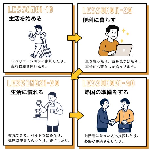 ●日本人留学生の目線で、渡米から帰国までの1年間を追体験できる、全40レッスンのストーリー仕立ての構成