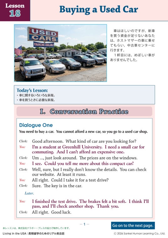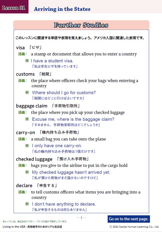 産経ヒューマンラーニング株式会社(本社:東京都新宿区、代表取締役:中谷友紀、以下「当社」)は、長期留学や海外渡航を控える方を対象に、現地でのスムーズな生活を支援するオンライン英会話教材『Living in the USA ~長期留学のためのリアル英会話』の提供を開始いたします。本テキストは、入国審査から大学生活、さらには現地でのトラブル対応まで、1年間のアメリカ生活をストーリー形式で体験しながら、知識としての英語ではなく、無意識に「使う」ための「生活英語」を習得することを目指した実践的プログラムです。