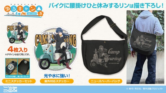 また、『ゆるキャン△ SEASON3』より、バイクに腰掛けひと休みする志摩リンの描き下ろしイラストを使用した「ニュースペーパーバッグ」「ステッカー」もラインナップいたします。