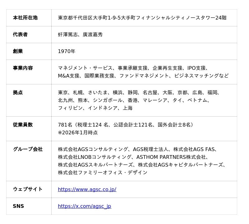 株式会社AGSコンサルティング(本社:東京都千代田区、代表取締役会長:虷澤篤志 代表取締役社長:廣渡嘉秀。以下「AGS」)に、2026年1月5日より、新たに常務取締役2名、取締役2名、執行役員5名が就任しましたことをお知らせいたします。