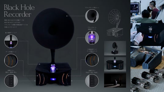 「Black Hole Recorder」は、量子ブラックホールに関する研究に着想を得て遠い未来を空想した、人工ブラックホール搭載の蓄音機型デバイスです。月の質量に相当する物体を約0.1mmの大きさに圧縮した人工ブラックホールに、理論上約10の52乗ギガバイト(10那由他バイト)のデータを録音したり、蓄えた情報を取り出したりできる、遠い未来の大容量ストレージのプロトタイプ(模型)となります。このサイエンスアート作品は、理研iTHEMSの依頼に基づき、ADK MS、ADKクリエイティブ・ワンなどのクリエイターが製作しました。