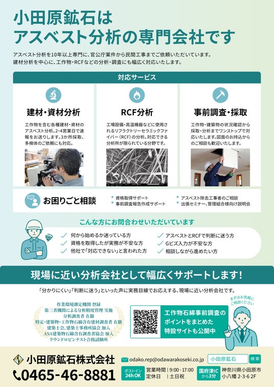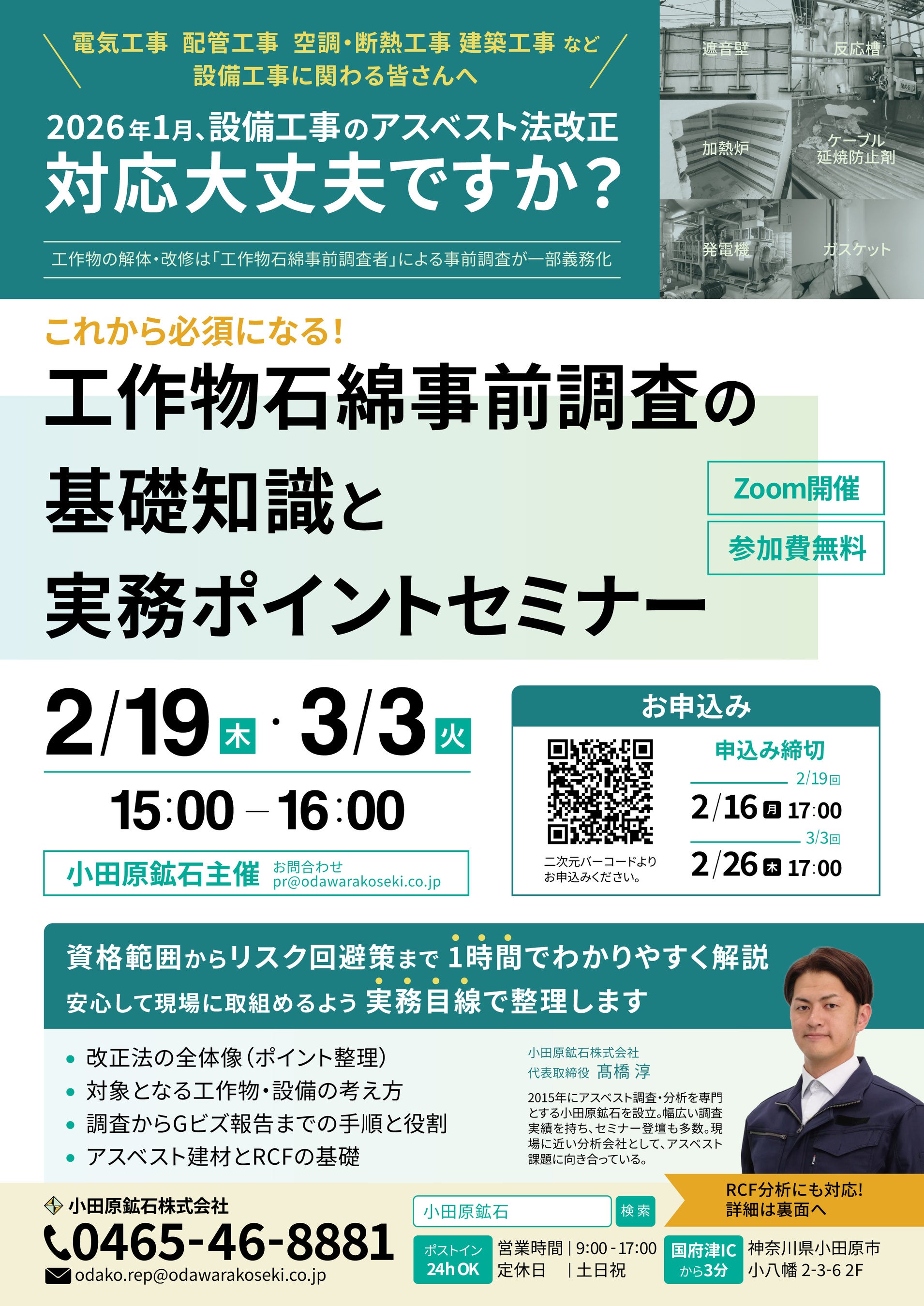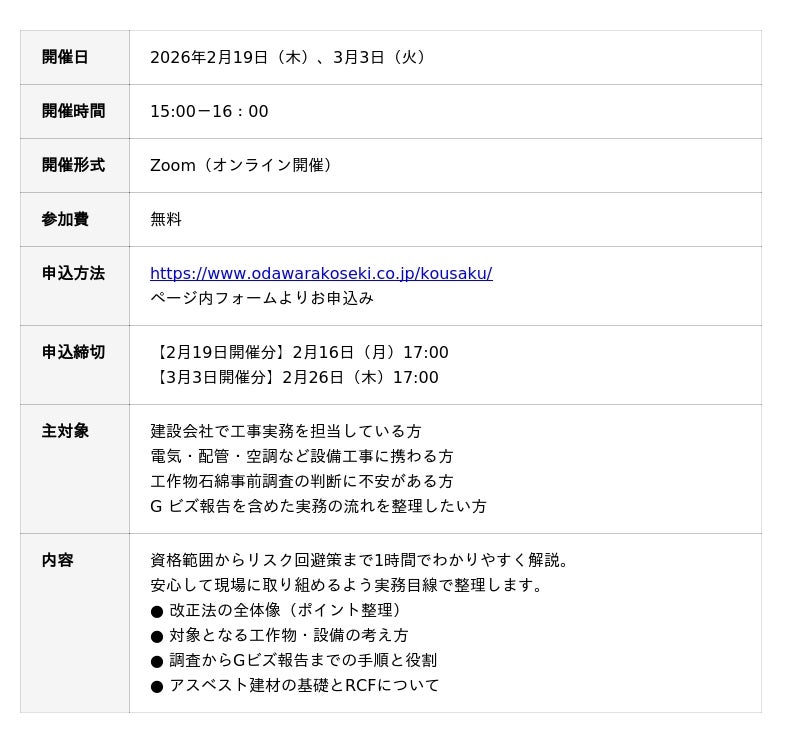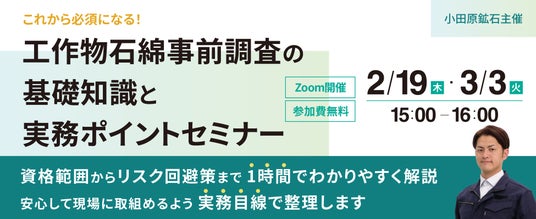 小田原鉱石株式会社(本社:神奈川県小田原市、代表取締役:高橋淳、https://www.odawarakoseki.co.jp/ )は、制度の基礎から現場で迷いやすいポイントまでを実務目線で解説する無料オンラインセミナー「これから必須になる!工作物石綿事前調査の基礎知識と実務ポイントセミナー」を2026年2月19日(木)および2026年3月3日(火)に開催いたします。