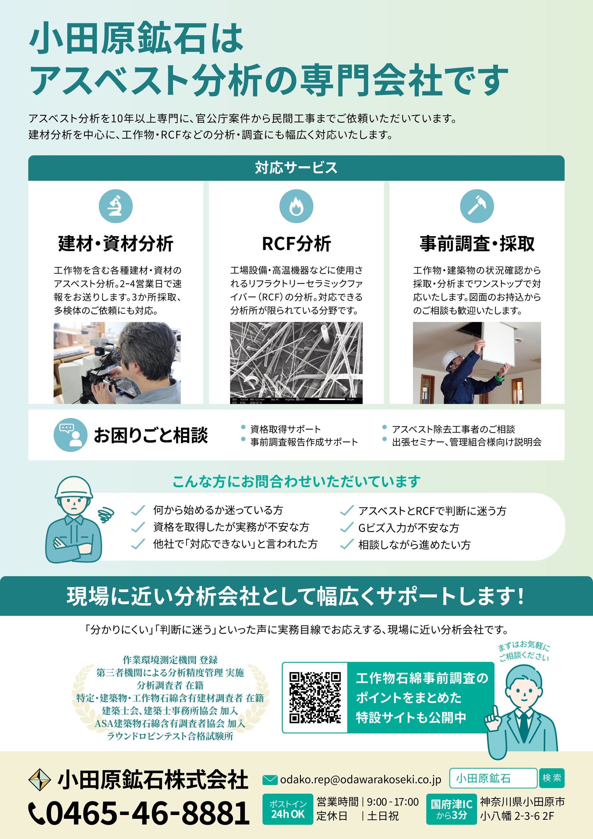 2015年にアスベスト調査・分析を専門とする小田原鉱石を設立し、代表を務める。行政施設、工場、ホテルなど幅広い建物の調査実績を重ねてきた。関連団体セミナーの登壇経験も多数あり、現場に近い分析会社として日々のアスベスト課題解決に取り組んでいる。
