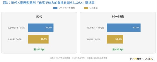 - 60代フルリモート層の70.0%が「自宅で体力的負担を減らしたい」と回答(フル出社層との差+36.2ポイント)