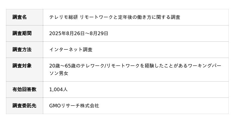 株式会社LASSIC(ラシック)(本社:東京都港区、本店: 鳥取県鳥取市、代表取締役社長: 若山幸司、以下「LASSIC」)が運営する、「場所に依存しない働き方」を推進・支援する情報を発信するWEBメディア「テレワーク・リモートワーク総合研究所(テレリモ総研)」は、「リモートワークと定年後の働き方」に関するアンケート調査を全国20歳~65歳の男女を対象に実施しました。