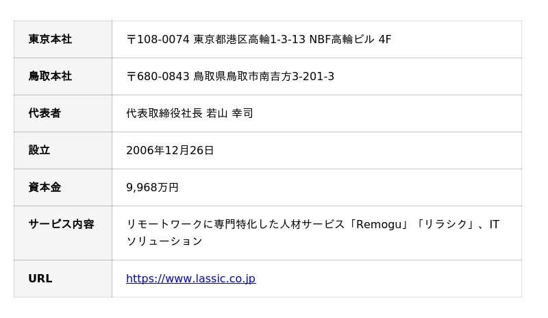 LASSICは2006年に鳥取県で創業し、『リモート社会をリードし、ボーダレスワークの実現によって社会に貢献する。』をビジョンに、「採用」「DX」分野においてボーダレスを促進させる仕組みづくりに邁進し、事業として社会貢献活動をしている企業です。