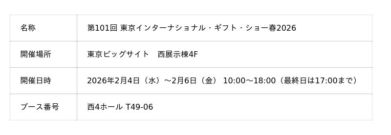2026. 2. 4 (水) ▶ 2. 6 (金) | 東京ビッグサイト(ギフトショー内) 西4ホール T49-06