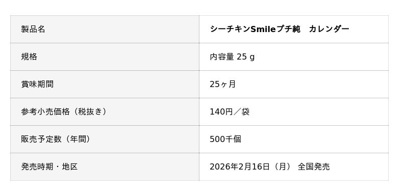 『シーチキン純』シリーズは、食塩・オイル不使用で、原材料はまぐろと天然水だけのシーチキンです。シリーズを通して、低塩分のきはだまぐろと静岡県の天然水のみを使用し、国内の工場で製造しています。今回は、『シーチキンSmileプチ』シリーズから、小容量25gの「シーチキンSmileプチ純」を発売します。既存品のメインユーザーである子育て世代と、食事に気を遣う60歳以上のお客様が、さらに簡単においしくお召し上がりいただけるように、フレークはなるべく細かくして水分を多めに含ませることで、やわらかな食べやすい食感に仕上げました。また、本製品は、店頭で見つけやすいように、カレンダータイプ(壁や棚に吊り下げるタイプ)で販売する仕様になっています。