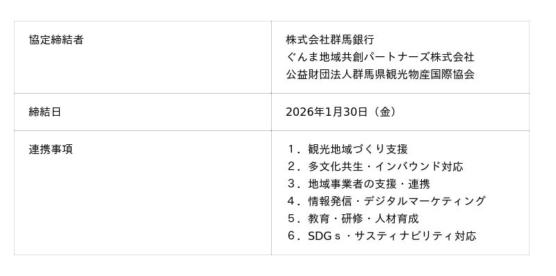 ぐんま地域共創パートナーズ(代表取締役 鏡山 英男、以下「GRASP」)と群馬銀行(頭取 深井 彰彦)は、2026年1月30日に公益財団法人群馬県観光物産国際協会(理事長 岩崎 真人)と、群馬県内における観光地域づくりおよび地域振興を推進するための包括連携協定書(以下、「本協定」)を締結しましたので、お知らせいたします。