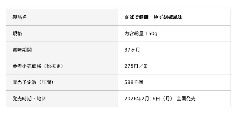 『さばで健康缶』シリーズは、国産のさばを使用し、さばに含まれる豊富なDHA、EPAを手軽においしくお召し上がりいただける缶詰シリーズです。今回は、さばと相性が良いゆず胡椒を使用し、ゆず胡椒のさわやかな辛みを感じられる味付けに仕上げました。ゆず胡椒の香りと辛みが、さばの脂をさっぱりと感じさせる相性抜群な組み合わせです。
