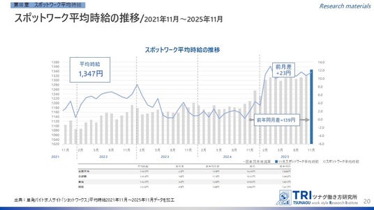 2025年11月度のスポットワーク平均時給は1,347円で、前月差+23円、前年同月差+139円となりました。通常のアルバイト平均時給は1,317円で(※リクルート発表「アルバイト・パート募集時平均時給調査」)、スポットワーク平均時給との比較では、スポットワークが30円高いという結果になっています。