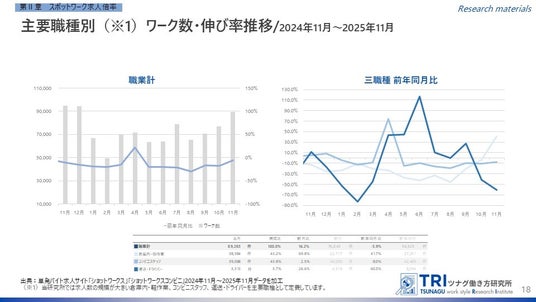 2025年11月度のワーク数の伸び率は前月比で16.2%増加、前年同月比で5.9%減少となりました。前年同月比では、7か月連続で前年同月を下回る結果となっています。主要3職種では、倉庫内・軽作業が前年同月比で41.7%増加となり、大幅に前年同月を上回りました。