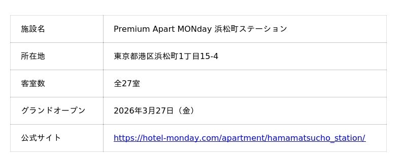 株式会社JHAT(本社:東京都、代表取締役:平林 朗)は、東京都港区・浜松町に「Premium Apart MONday 浜松町ステーション」(全27室)を2026年3月27日(金)に開業いたします。