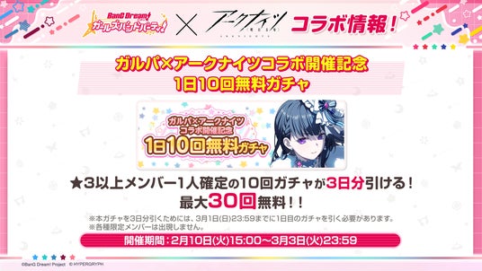 2月10日(火)15時から3月3日(火)23時59分までの間、「ガルパ×アークナイツコラボ開催記念1日10回無料ガチャ」を開催します。10回無料ガチャを3日分引くことができ、最大30回ガチャを引くことができます。