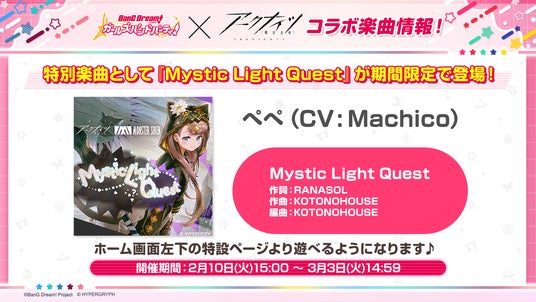 コラボの開催を記念し、2月10日(火)15時に、アークナイツのEP曲『Mystic Light Quest』の原曲の期間限定での登場が決定いたしました。