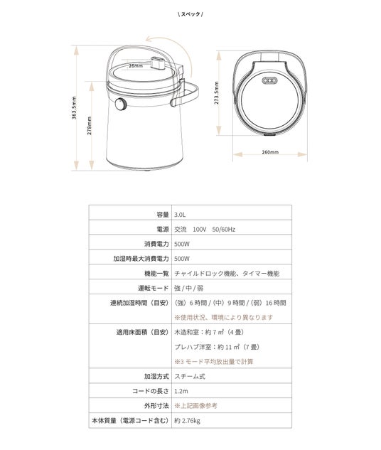 「クリーンポット」はコンパクトながらも、3.0Lの大容量タンクでたっぷり加湿。