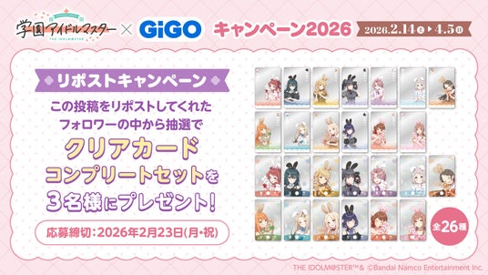 株式会社GENDA GiGO Entertainment(本社:東京都港区 代表取締役社長:二宮 一浩、以下「当社」)は、GiGOグループのお店におきまして、『アイドルマスター』シリーズの最新作、歌とダンスが上手くなるアイドル育成シミュレーションゲーム『学園アイドルマスター』とコラボした「『学園アイドルマスター』×GiGOキャンペーン2026」を2026年2月14日(土)より開催いたします。