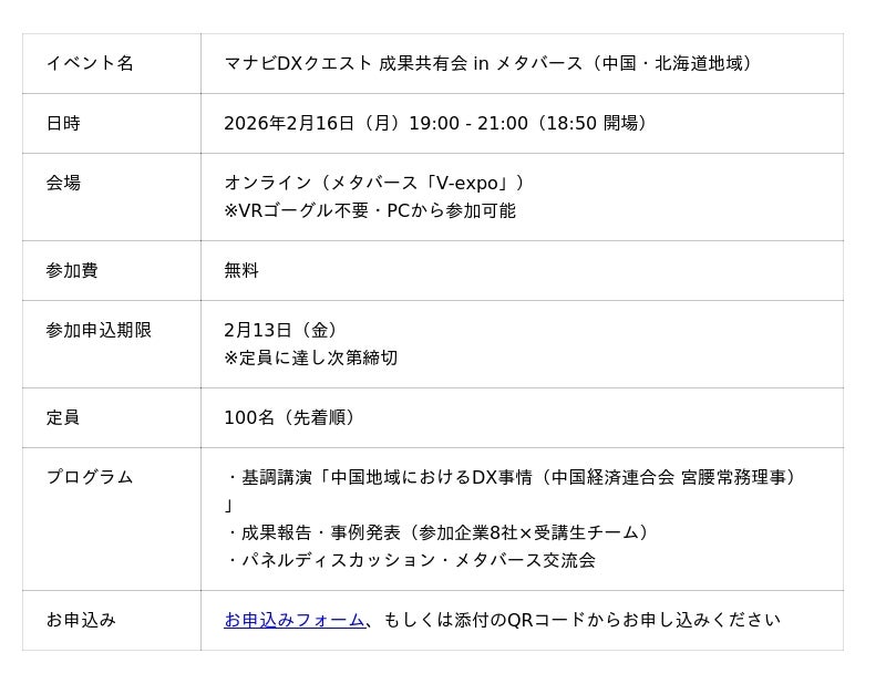 DX支援およびIT教育を展開する株式会社SAMURAI(本社:東京都港区、代表取締役:羽田 吾立)は、経済産業省中国経済産業局より受託した「マナビDXクエスト(令和7年度事業)」において支援してきた中国・北海道地域におけるDX推進の成果・事例を、2026年2月16日(月)の成果報告会にて発表いたします。