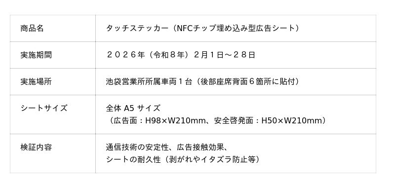 この媒体は、 バスの座席背面に配置されるため着席時の視認率が高く、深い訴求力が期待できます。また、WEBとの連動による情報のリアルタイム更新やデータ分析も可能となり、若年層をはじめとする幅広い層への効果的なマーケティングを支援します。さらに、ステッカー下部には車内事故防止の注意喚起を表示し、公共交通としての安全の啓蒙と広告媒体としての機能を両立させています。本テスト運用を通じて媒体の耐久性やお客様の利用状況を検証し、2026年度の本格的な販売開始を目指してまいります。