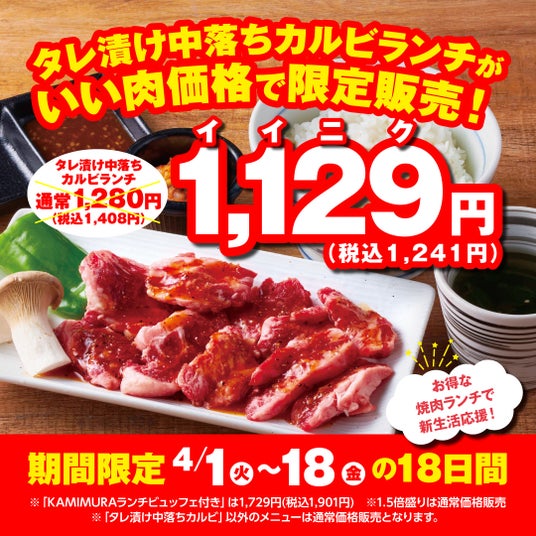 ◆内容:期間中「タレ漬け中落ちカルビ」セットを1,129円(税込1,241円)、また「KAMIMURAランチビュッフェ」付きを1,729円(税込1,901円)で販売 ※1.5倍盛は通常価格販売です ※「タレ漬け中落ちカルビ」セット以外は通常価格販売です。
