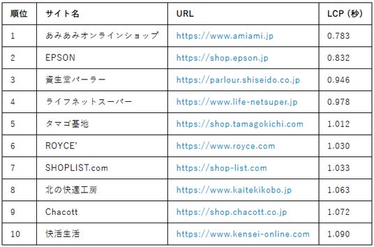 - 1秒の壁を突破する重要性:今回の調査で特筆すべきは、トップ10のサイトすべてがLCP(Largest Contentful Paint)1.1秒以下を達成していることです。「あみあみオンラインショップ」を筆頭に、EPSON、資生堂パーラーといった各業界を代表するサイトが、驚異的な表示速度を実現しています。