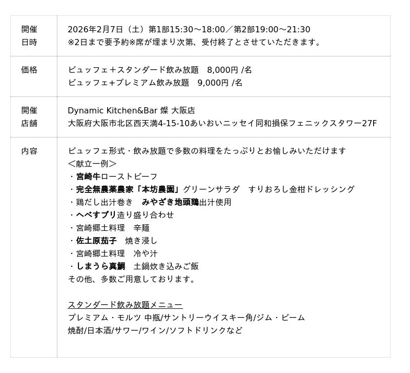 「Dynamic Kitchen&Bar 燦 大阪店」では2月7日(土)に宮崎の恵みをビュッフェ形式で愉しむイベント「宮崎県×燦 in OSAKA」を開催