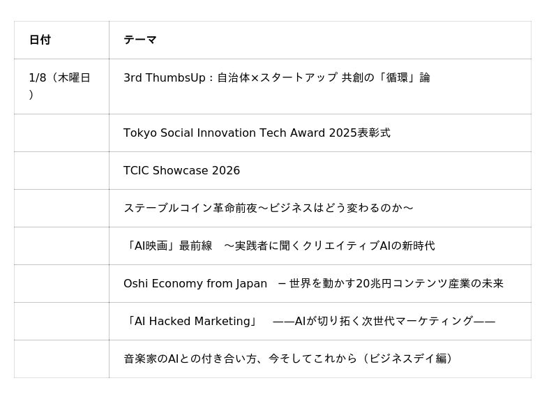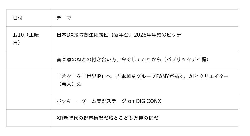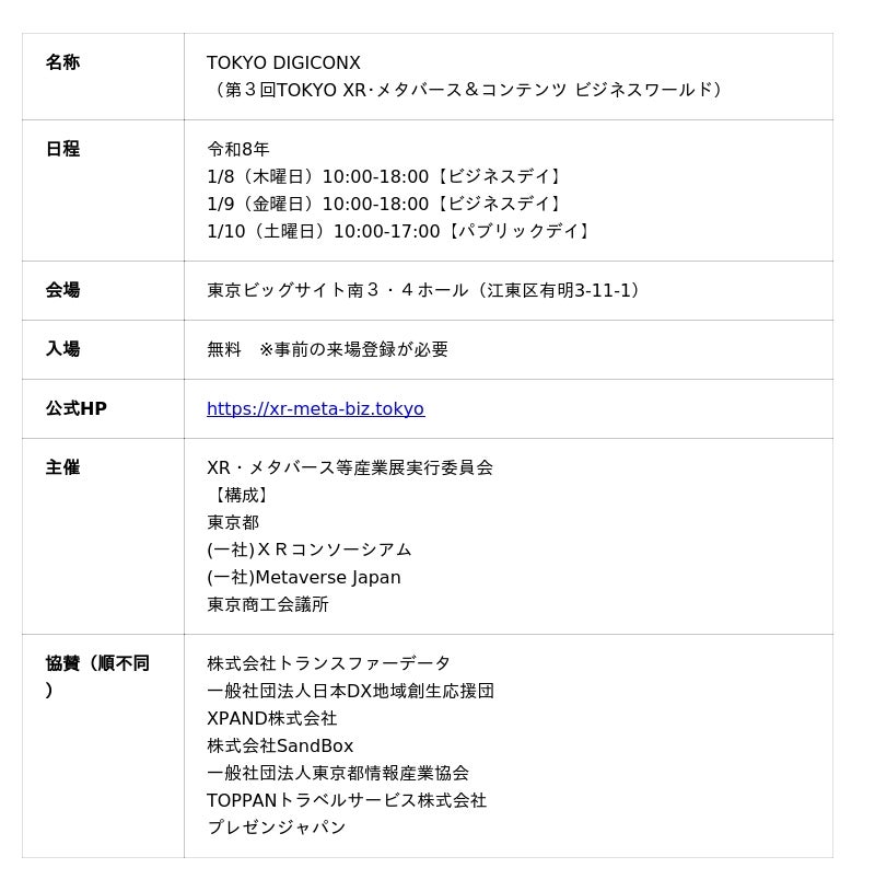 東京都及びXR・メタバース等産業展実行委員会(以下、「実行委員会」という。)はXR・メタバース、AI、Web3及びコンテンツに関連する都内産業の更なる活性化を図ることを目的として、関連する事業者が一堂に会す「TOKYO DIGICONX(第3回TOKYO XR・メタバース&コンテンツ ビジネスワールド)」(以下、「展示会」という。)を令和8年1月8日(木曜日)~1月10日(土曜日)の3日間にわたり、東京ビッグサイト南3・4ホールにおいて開催しました。