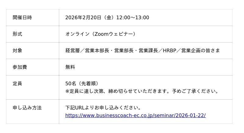 ビジネスコーチ株式会社(本社:東京都港区、代表取締役社長:細川 馨、東証グロース:9562)の子会社であるエグゼクティブコーチ株式会社(本社:東京都港区、代表取締役社長:出口 亮輔、以下当社)は、2月20日(金)に、シェルパワークス株式会社と共催セミナーを開催いたします。