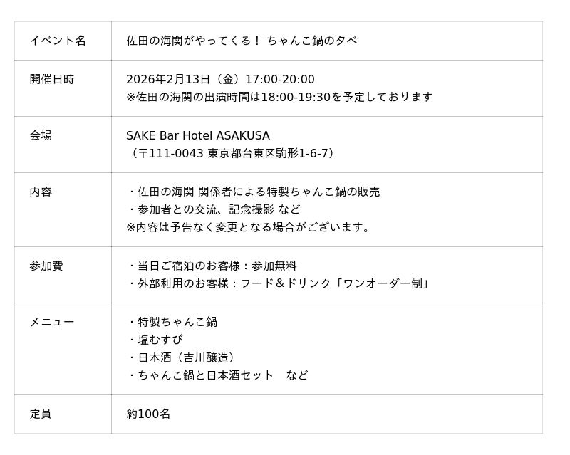 シマダグループの一社であるシマダハウス株式会社(東京都渋谷区、代表:島田一成)が運営する「SAKE Bar Hotel ASAKUSA」(東京都台東区駒形)では、佐田の海 (さだのうみ)関をお迎えした特別イベント「ちゃんこ鍋の夕べ」を、2026年2月13日(金)に開催いたします。