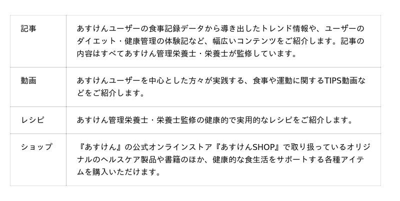 このような強いニーズにお応えするため、当社はWebメディア『あすけんmore』をオープンします。『あすけんmore』は、あすけん管理栄養士・栄養士が持つ高い専門性や、100億件を超えるユーザーの皆さまの食事記録データをもとに、信頼性と実用性を兼ね備えた食生活改善のヒントとなる情報を提供します。『あすけん』を利用中の方はもちろん、利用されていない方の健康的な食生活の実現にも貢献できるよう、役立つ情報を広く発信してまいります。