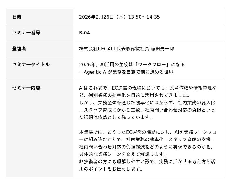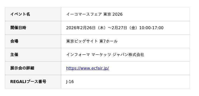 株式会社REGALI(本社:東京都渋谷区、代表取締役:稲田光一郎)は、2026年2月26日(木)~27日(金)に開催される「イーコマースフェア 東京 2026」に出展することをお知らせいたします。