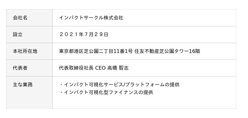 インパクトサークルは、インパクト可視化サービスの提供を通じ、金融機関・事業会社・自治体等の社会的インパクト創出活動を支援すると共に、社会的課題解決事業に投融資が循環する社会の創造に向け、事業活動に取り組んでいます。