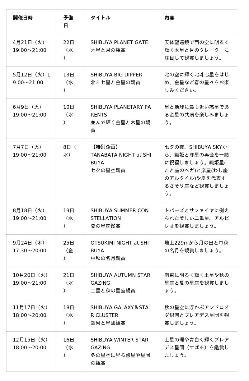 「ROOFTOP 天体観測」は「渋谷スクランブルスクエア」の14階・ 45階・ 46階・屋上に位置する展望施設、「SHIBUYA SKY」で体験できる渋谷スクランブルスクエア株式会社主催の天体観測イベントです。