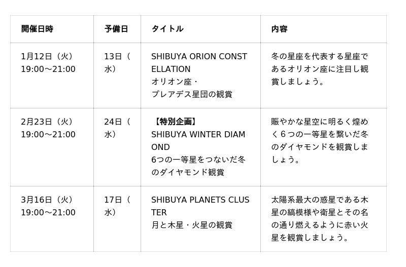3月に観られる皆既月食でも注目を浴びている「月」に関する知識を広く深く学ぶことに加えて、自分だけのオリジナルデザインの「手作り双眼鏡」を制作します。月を学ぶ教室の後は、SHIBUYA SKY屋上にてガイドの解説を聞きながら、天体望遠鏡とオリジナル双眼鏡を使って月を観察します。また、天体望遠鏡にて「月」を撮影し、スクリーンに投影して、観察します。渋谷上空229mから「月」をのぞいてみませんか。月以外に木星やプレアデス星団も観察します。