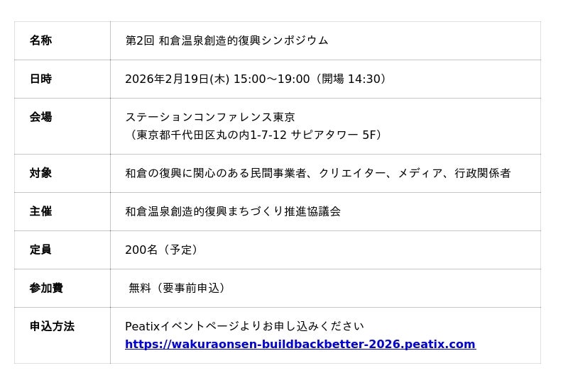 和倉温泉創造的復興まちづくり推進協議会(石川県七尾市/代表:多田 健太郎〈多田屋 社長〉)は、2026年2月19日(木)、ステーションコンファレンス東京(東京都千代田区)にて2回目となる「和倉温泉創造的復興シンポジウム」を開催いたします。