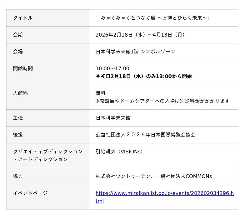 日本科学未来館(略称:未来館 館長:浅川智恵子)は、「未来社会の実験場」のコンセプトのもと開催された「大阪・関西万博」を振り返り、その成果を未来へとつなぐ企画を実施します。第一弾として、「みゃくみゃくとつなぐ展 ~万博とひらく未来~」を、2026年2月18日(水)~4月13日(月)に開催します。