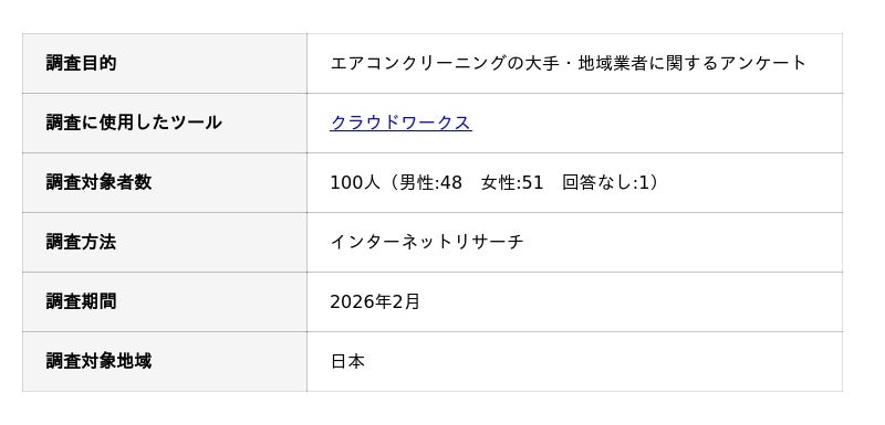 エアコンクリーニングの大手・地域業者に関するアンケート調査の概要