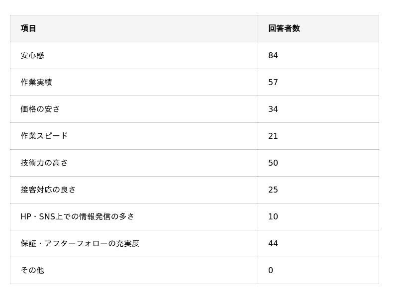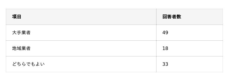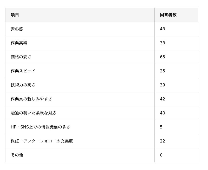 - 大手業者には「安心感」が一番期待されており、地域業者には「価格の安さ」や「作業員の親しみやすさ」が期待されている。