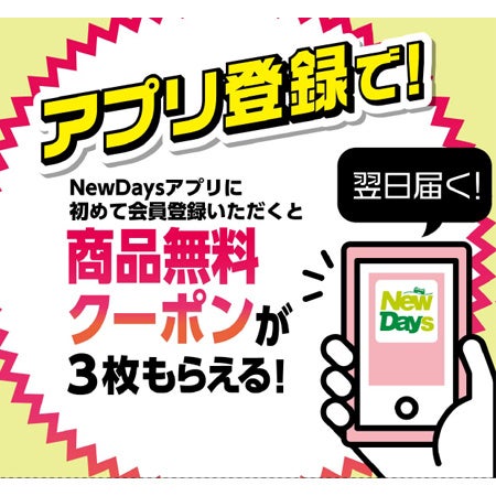 NewDaysアプリに初めて会員登録をすると、登録の翌日に商品の無料引換クーポンを3枚配信いたします。
