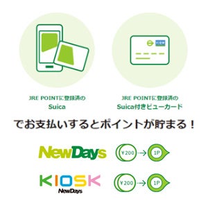 NewDaysでは、JRE POINT WEBサイトに登録したSuicaでお買い物をすると、200円